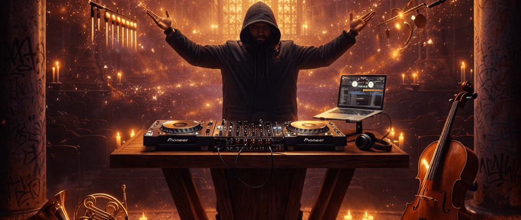 There are rap songs that borrow from classical music, and then there is Thug Symphony — a JØNEZ release that doesn't sample the orchestra so much as bleed into it. Opening with sleigh bells and glockenspiel over ambient pads that feel lifted from a winter funeral no one planned for, the track establishes a world where melancholy has architecture and grief has a tempo. The male lead moves through auto-tuned melodic rap with a soulful, experimental delivery that draws from Young Thug's elastic vocal philosophy and Brian Wilson's instinct for harmony — a combination that should be contradictory and somehow isn't. French horns cry through the verses. A theremin wails into the pre-chorus. Cellos carry the bridge like a trap lullaby played in a baroque chapel. The lyrics don't reach for metaphor so much as live inside it — "Art deco pain in a gilded rhyme" isn't a boast, it's a self-portrait. By the time the final chorus swells with gospel harmonies and the horns begin their long farewell, Thug Symphony has made the case that the most sophisticated music being made right now lives at the exact intersection of the streets and the symphony hall. Stream it now on Spotify — headphones required.
